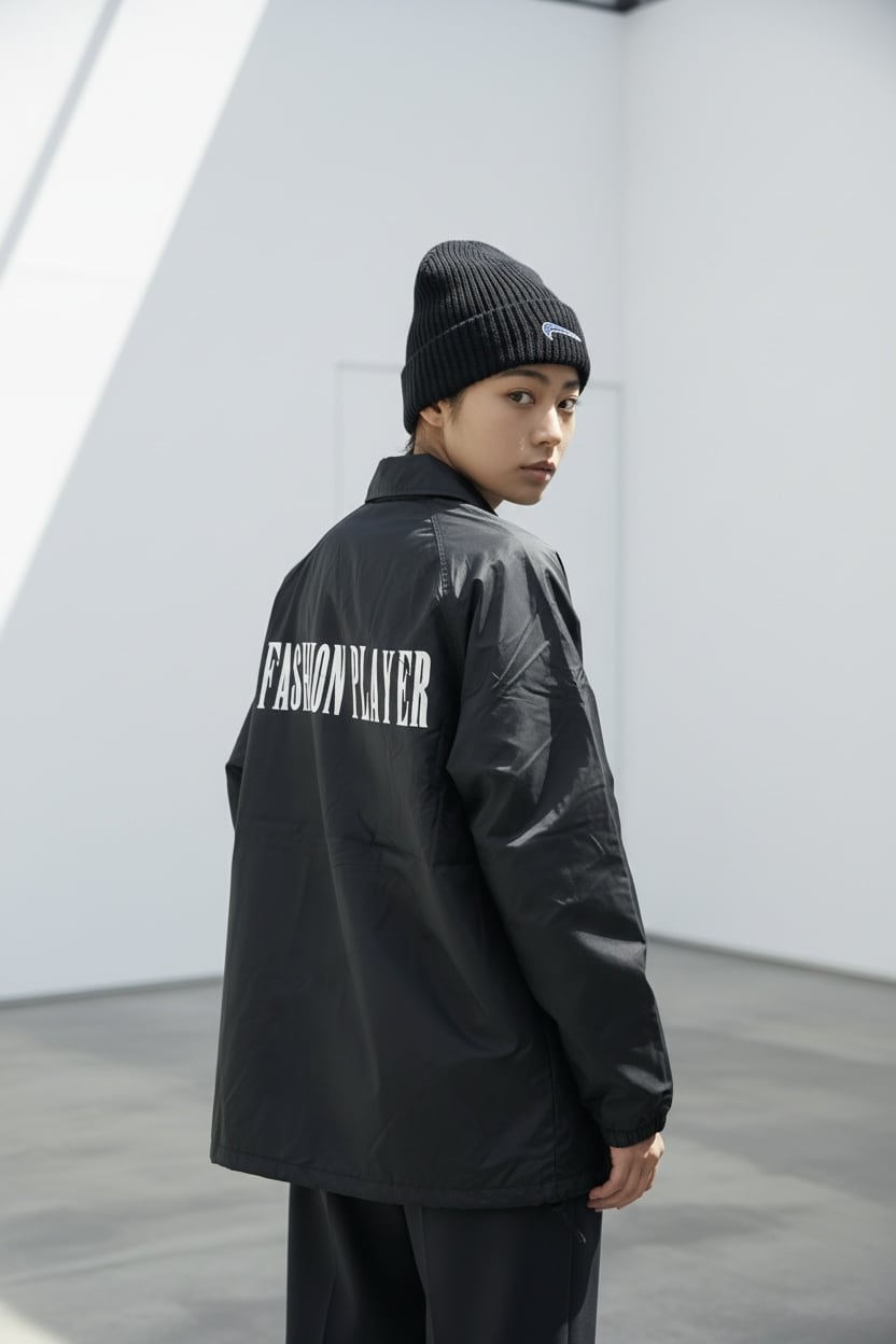 背中に配置された “FASHION PLAYER” の文字は、